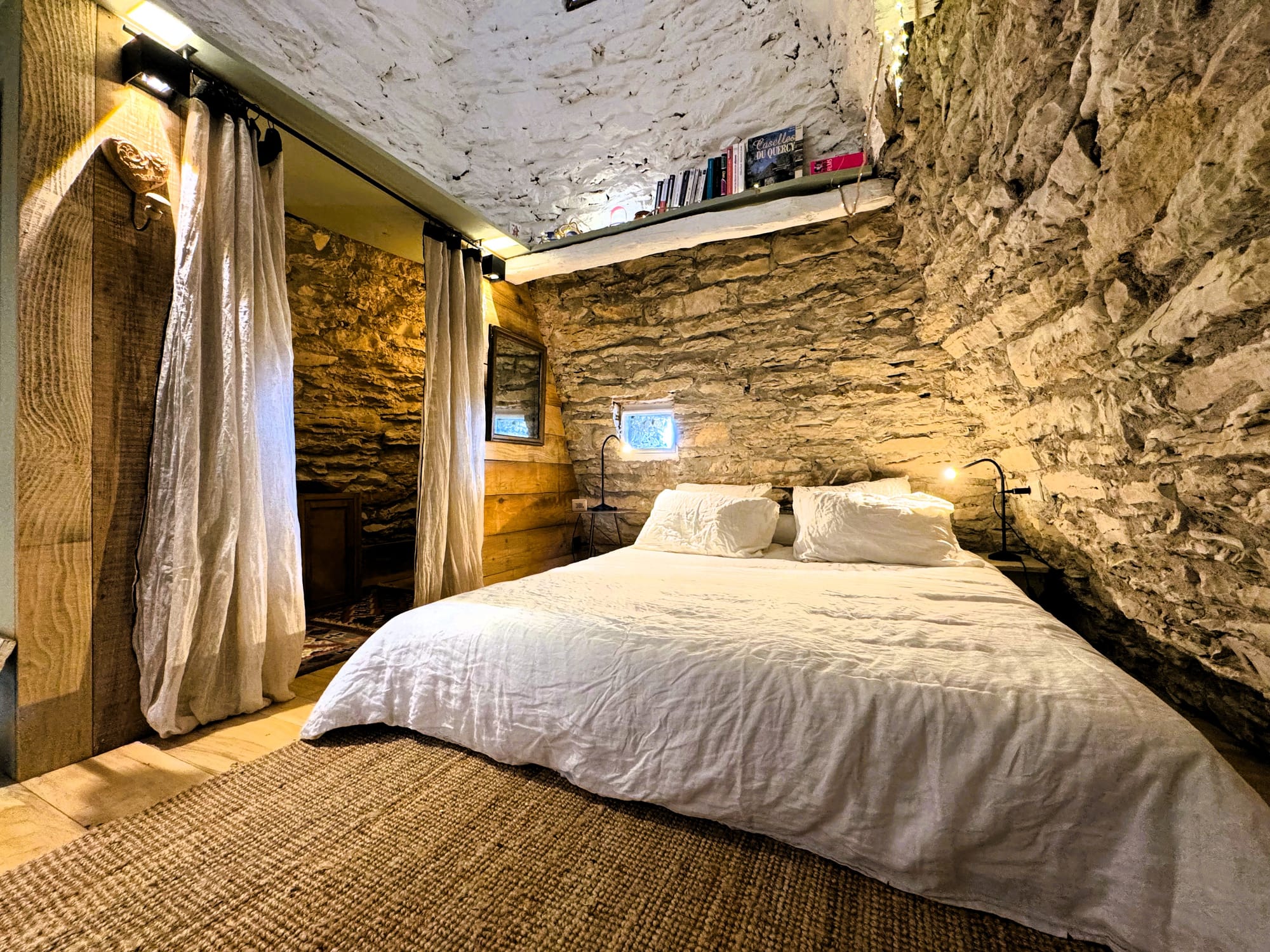 À l’intérieur, la magie continue. Pierre brute, bois et lumière douce composent une pièce de vie chaleureuse, subtilement rehaussée par les touches d’un confort minimaliste. Un escalier en métal brut mène à la chambre, comme un nid secret. Un plafond voûté en pierres chaulées et des lumières feutrées dessinant une ambiance féerique veillent sur un lit douillet propice aux rêves. Un coin lavabo avec commodités, charmant et parfaitement intégré, complète cet espace intime avec élégance.